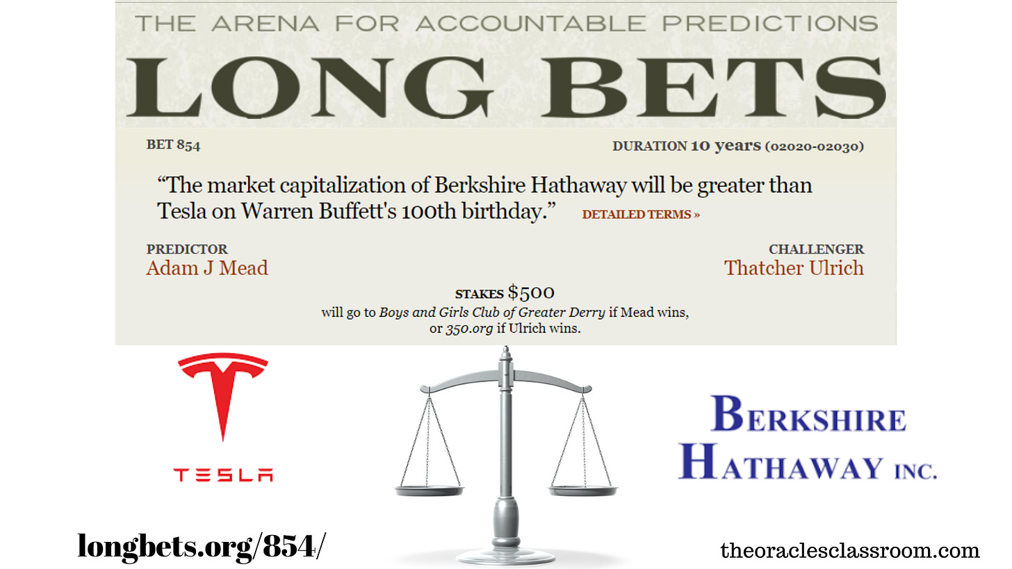 I put up $250 that Berkshire Hathaway’s market cap would be more than Tesla’s on August 30, 2030, which is Warren Buffett’s 100th birthday. My rationale was that Berkshire possesses real assets and earning power while Tesla is a fledgling car company that happens to be a hot stock.