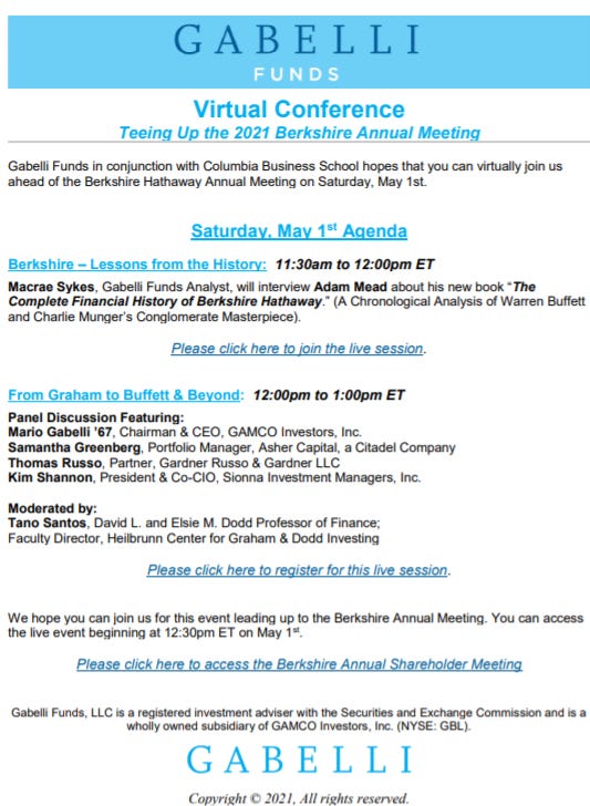 Pre-meeting events: I'll be participating in a virtual Columbia Business School event at 11:30am (EST) tomorrow to talk about my book. At 12:00 to 1pm there will be a panel headlined by Mario Gabelli.