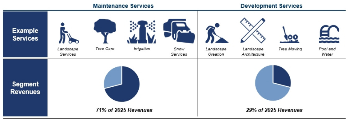 The company’s development services segment is more project-based. Projects can range from $100,000 up to $10 million, with an average size (2024) of $1.3 million. BrightView may be hired by a general contractor on larger jobs, and on these and other projects, it manages downstream services providers such as fencing installation.