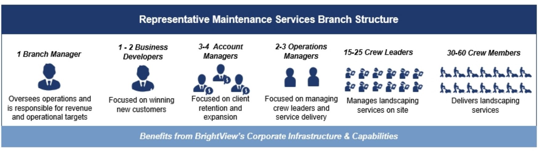 Branches serve both maintenance and development customers. Each branch services between 25 to 100 customers across 50 to 250 sites and generates between $2 and $22 million of annual revenue.