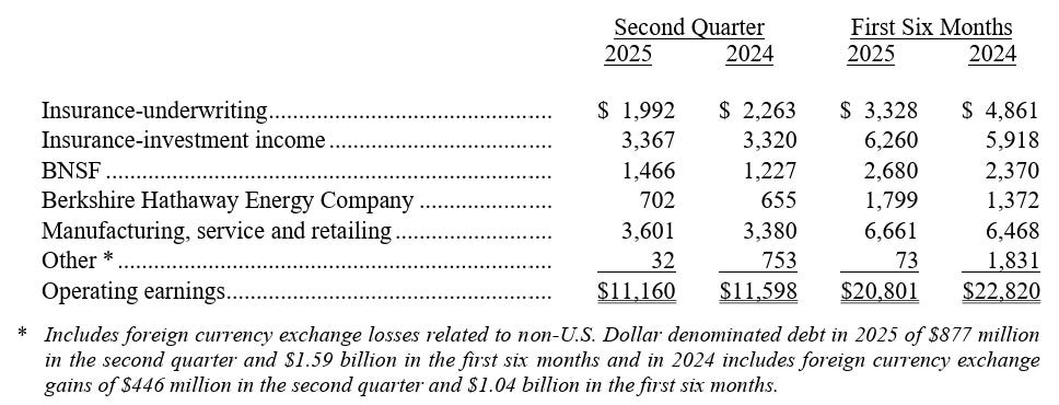 Operating earnings UP. Properly adjusted for foreign currency moves, Berkshire’s YTD operating earnings increased 2.3% from $21.8 billion to $22.3 billion. Read the footnote to the operating earnings line below carefully.