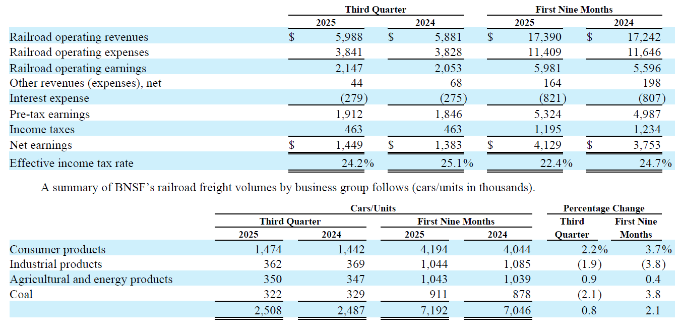 BNSF moved 2.5 million units in Q3, up 0.8% from 2024. YTD is up 2.1% to 7.2 million units.