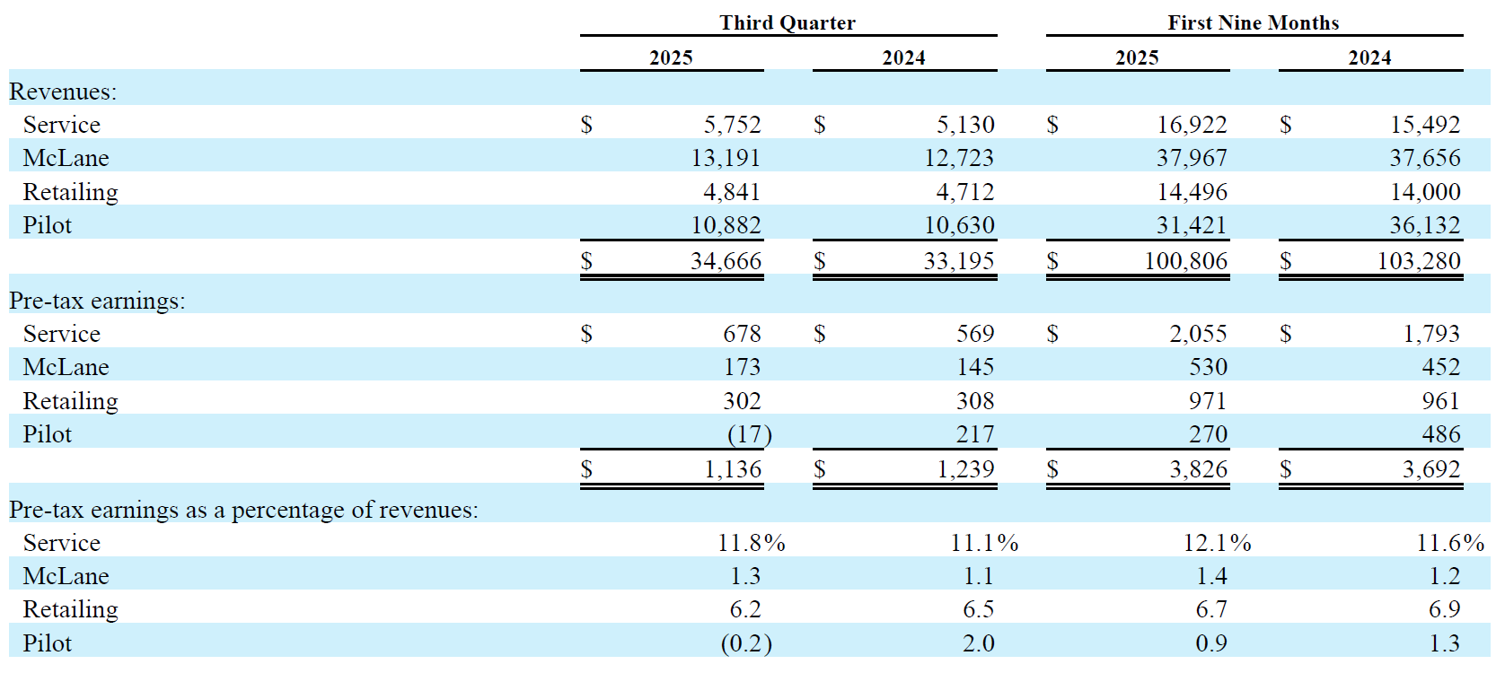Pilot swung to a rare loss of $17 million in Q3 on $10.9 billion of sales. Pre-tax earnings were off 44% YTD due to lower wholesale fuel and in-store gross margins, couples with higher costs. Berkshire also pointed to “charges from adjustments to certain fuel-related balance sheet accounts” — I’m stumped on that one.