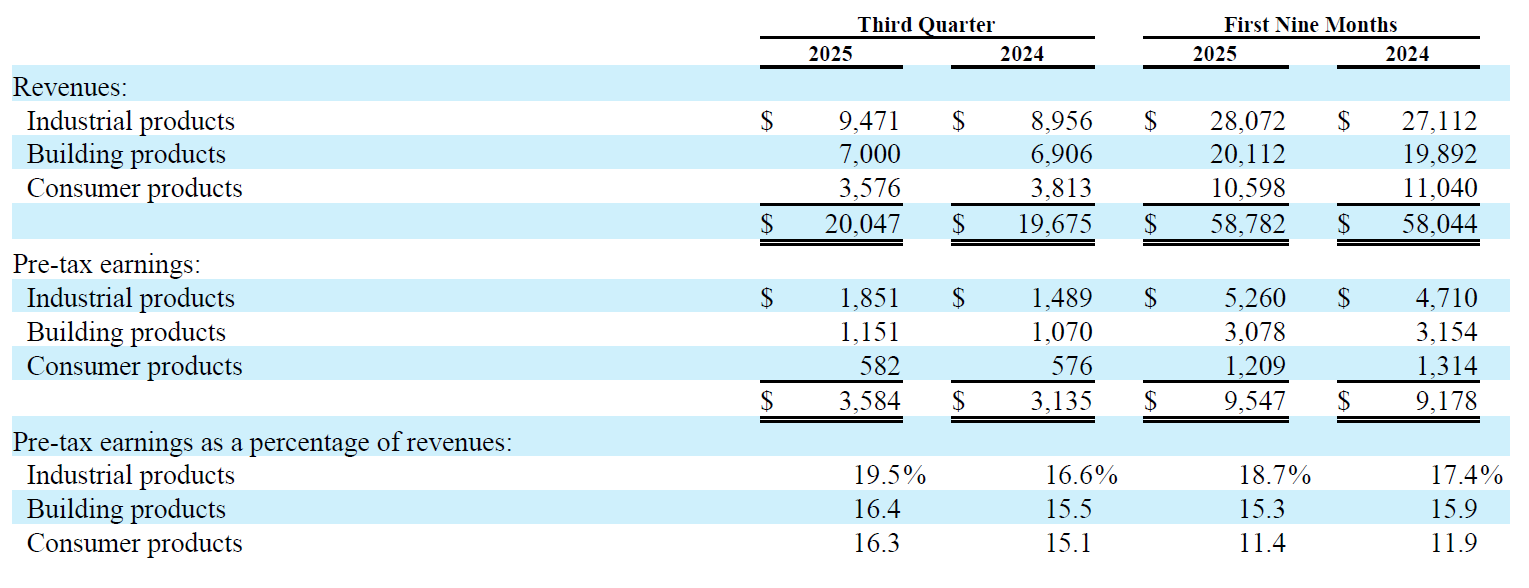 Results in consumer products included an unspecified amount for advanced manufacturing production income tax credits from 2023 to 2025, all recorded in Q3 of 2025. Berkshire noted that results in consumer products “declined significantly” before the benefit of these credits, with weakness in Jazwares, Forest River, Duracell, and Fruit of the Loom. Brooks was singled out as reporting higher earnings.
