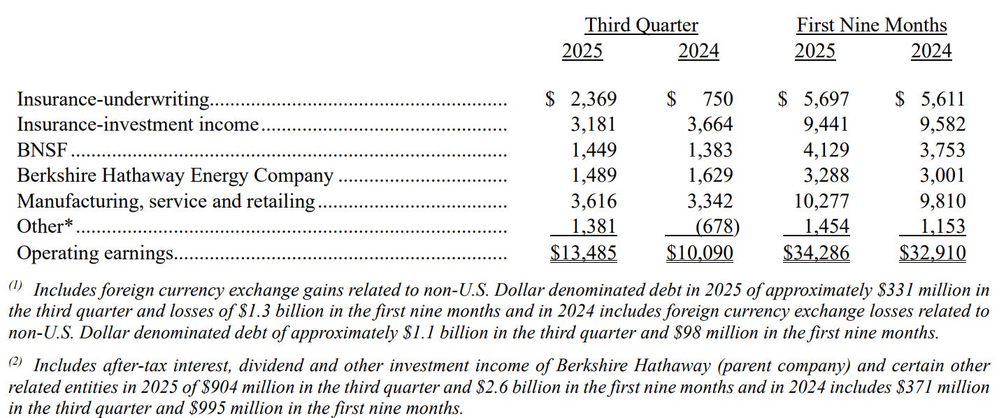 Operating earnings were $2.1 billion in Q3 and just shy of $6 billion YTD. Net earnings were $1.45 billion in the quarter and $4.1 billion YTD. BNSF shipped $3.2 billion or 78% of its net earnings to Omaha as a dividend.