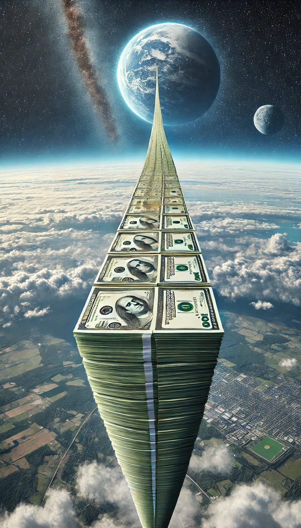 Here’s Chat GPT’s attempt to visualize it (Somehow the money is coming up from the Earth’s surface AND going out from space; AI is amazing but also pretty funny at times.)