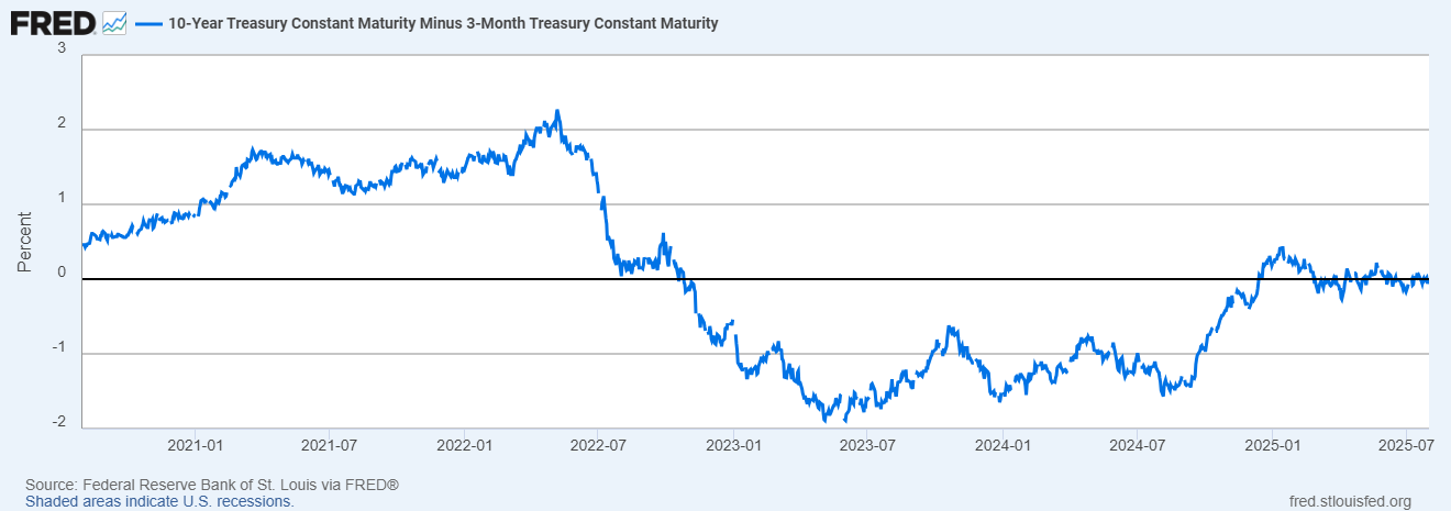 While I was on FRED I thought I’d pull the latest 3M/10Y spread. It’s been pegged around zero since regaining positive territory earlier in the year.
