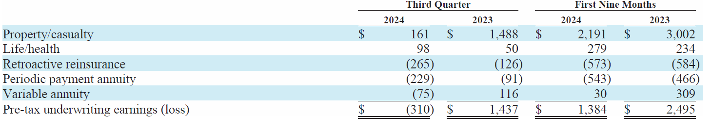 In the case of the retroactive reinsurance business, it took a hit to the tune of $610 million in the first 9 months of 2024 from amortization of deferred charges booked at the inception of the contracts years ago. These non-cash charges make the reported results look much worse than the economic reality.1