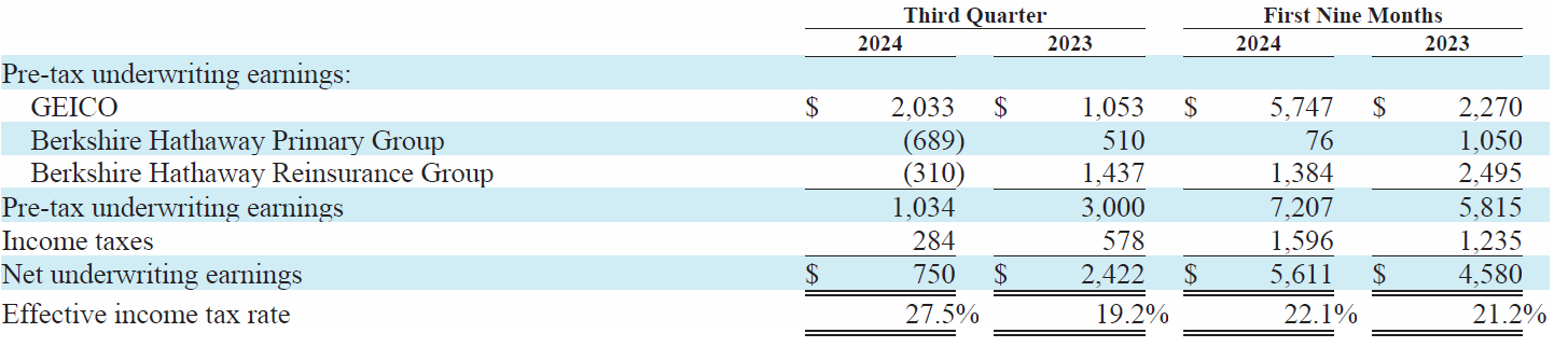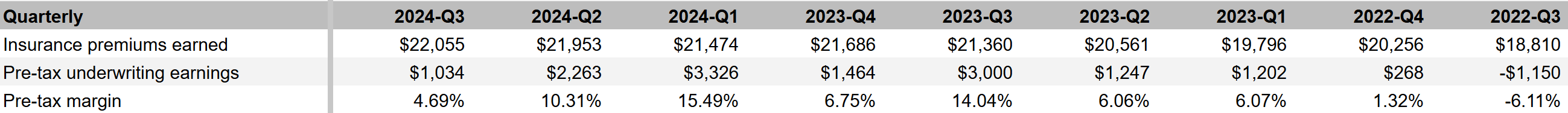 The $1,034 million pre-tax underwriting gain in Q3 is a highly satisfactory result for Berkshire’s insurance operations, representing a pre-tax margin of 4.7%. It is only in comparison to recent quarters that it looks “worse”.