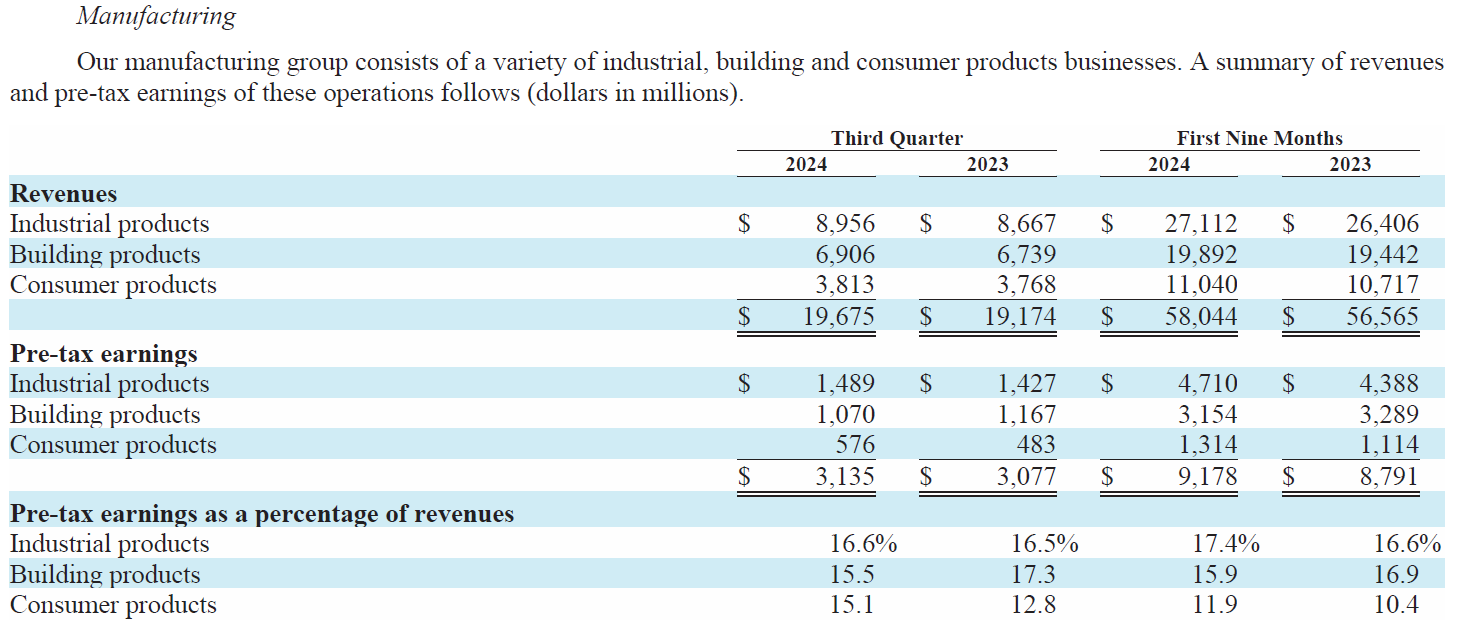 Building Products saw a 2.5% decline in revenues in Q3 and 2.3% YTD while pre-tax earnings declined 8% in Q3 and 4% YTD.