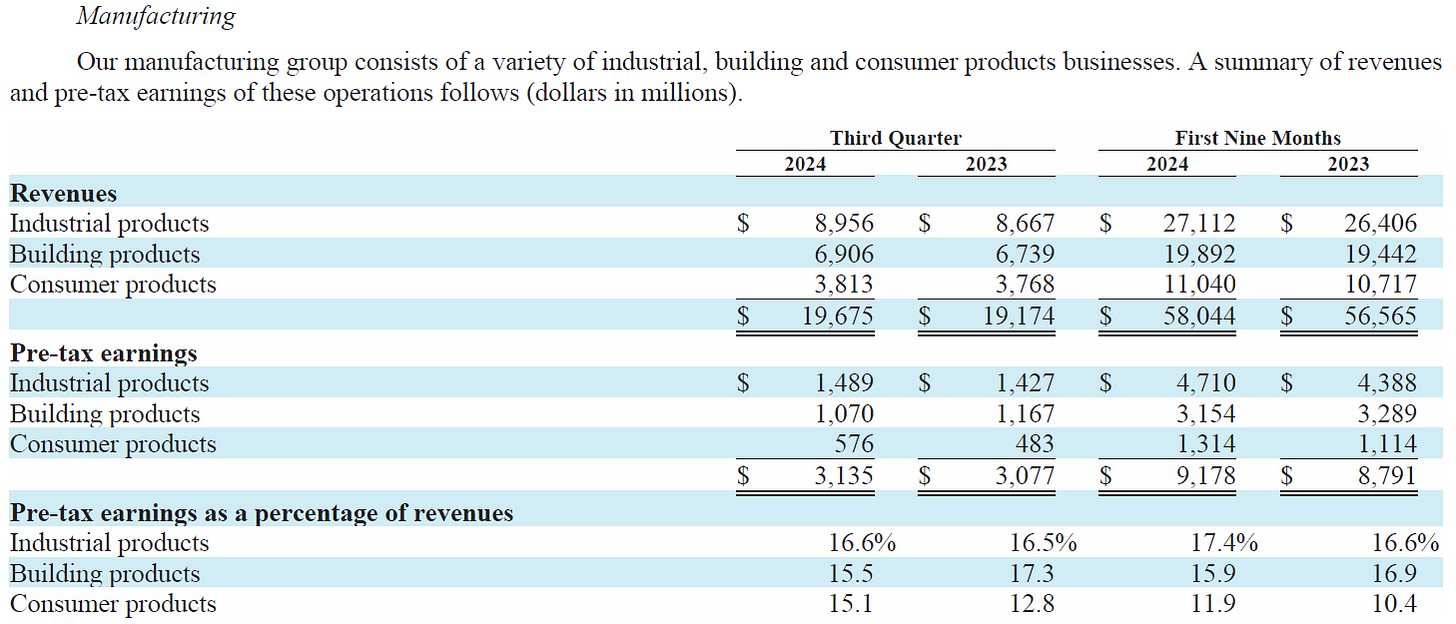 Other building products businesses (Johns Manville, MiTek, Benjamin Moore, Shaw, Acme Brick) held up fairly well with only slightly lower revenues and pre-tax earnings compared to prior periods.