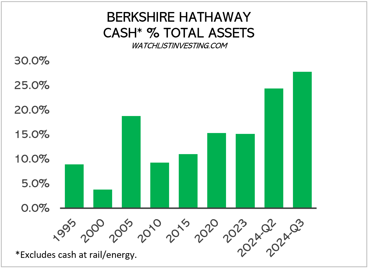 The big story of Q3 is Berkshire’s cash position. At $320 billion excluding rail/energy and $325 billion in total, Berkshire’s cash is at an all-time high in absolute terms and relative to total assets (28%). I recently spoke to the Wall Street Journal about my thoughts, which I’ve elaborated below.