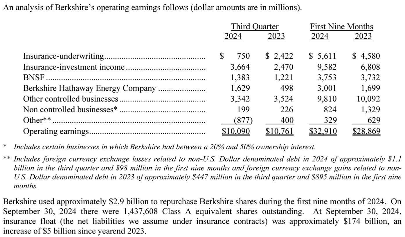 Berkshire packs a lot into its quarterly press releases. In half a page we can see a summary of operating earnings across its major business lines, the amount of share repurchases, shares outstanding, and the quarter-end insurance float.