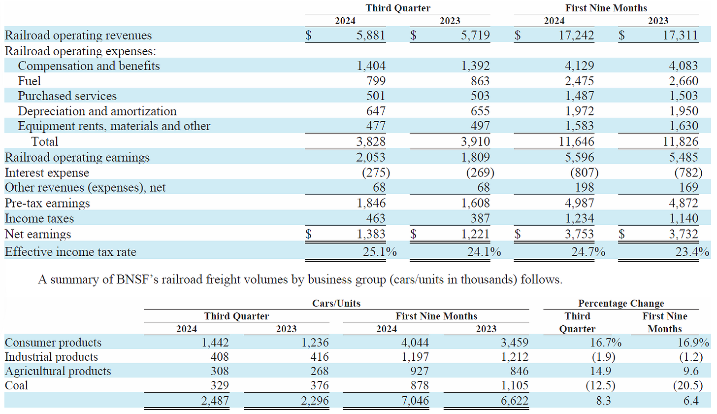 The performance of Berkshire’s rail is getting better but still lags its main rival, Union Pacific. Operating earnings increased 15% compared to the same quarter last year. However, its operating ratio (the ratio of expenses to revenues) was 65% compared to Union Pacific which reported an operating ratio of 60.3% in the third quarter.