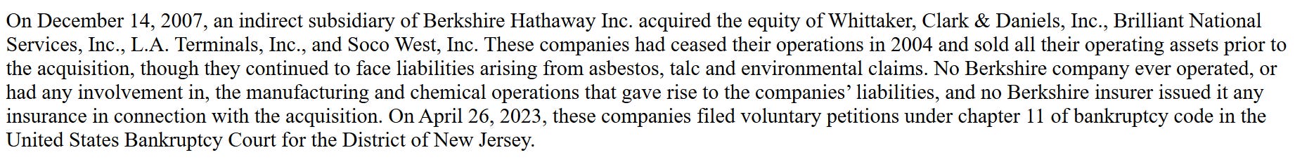 From what I could find online, it relates to asbestos and talc liabilities. Here’s an SEC filing from Berkshire in 2023 related to the matter: