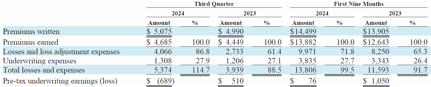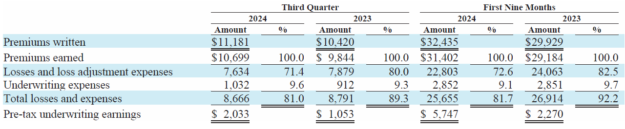 Reinsurance results are necessarily “lumpy”. And what at first glance may seem to be poor results with a pre-tax underwriting loss of $310 million, it’s important to remember the time value of money nature of the retroactive reinsurance and annuity businesses. As an extreme example, the periodic payment annuity business wrote no premiums in all of 2023 and YTD 2024. The loss is from the accretion of discounted liabilities and forex gains/losses.