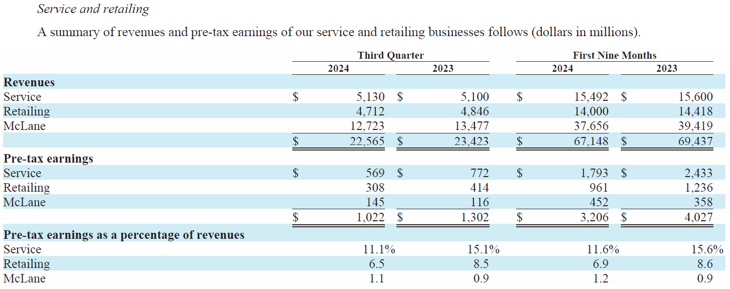 McLane reported a decline in revenues of 6% in the quarter and 5% YTD, with the restaurant business declining 8% YTD. Pre-tax earnings, however, increased 25% in Q3 and 26% YTD from higher margins and lower operating expenses. McLane’s pre-tax margin of 1.1% may look slim but it’s quite high historically.