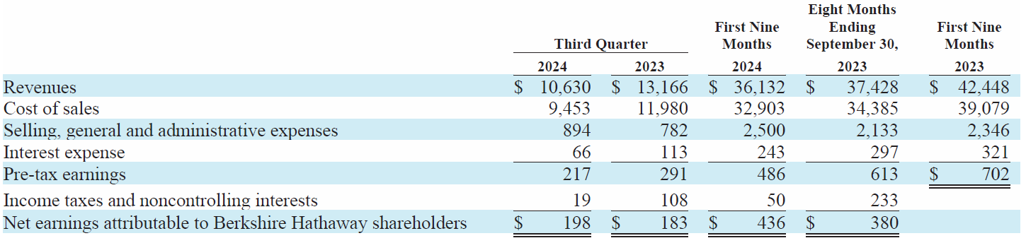 Again, detail here is important. This segment includes Clayton Homes, which increased revenues nearly 9% in both the quarter and YTD, and saw a 16% decline in pre-tax earnings in the quarter and a decline of 6% YTD which Berkshire says was primarily from lower financial services earnings.