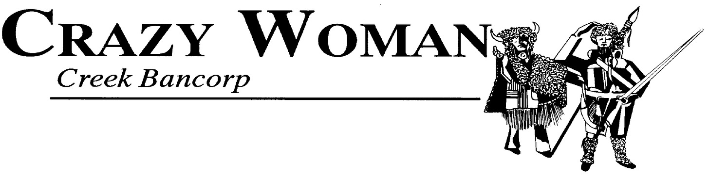 The bank is Crazy Woman Creek Bancorp. I admit to doing a double-take when I first saw the name. Such names aren’t uncommon in the Western US. This bank is named (not surprisingly) after an actual creek. You can read all about it here.