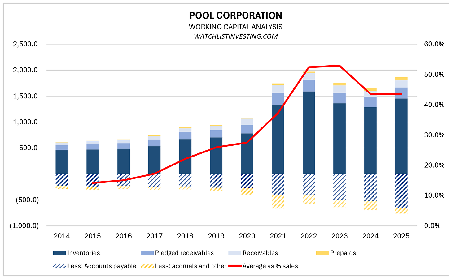 Pool Corp’s working capital structure is a function of its distribution model. The company carries significant inventory (purchased from manufacturers, including early-buy pre-season inventory) financed in part by accounts payable to those manufacturers.