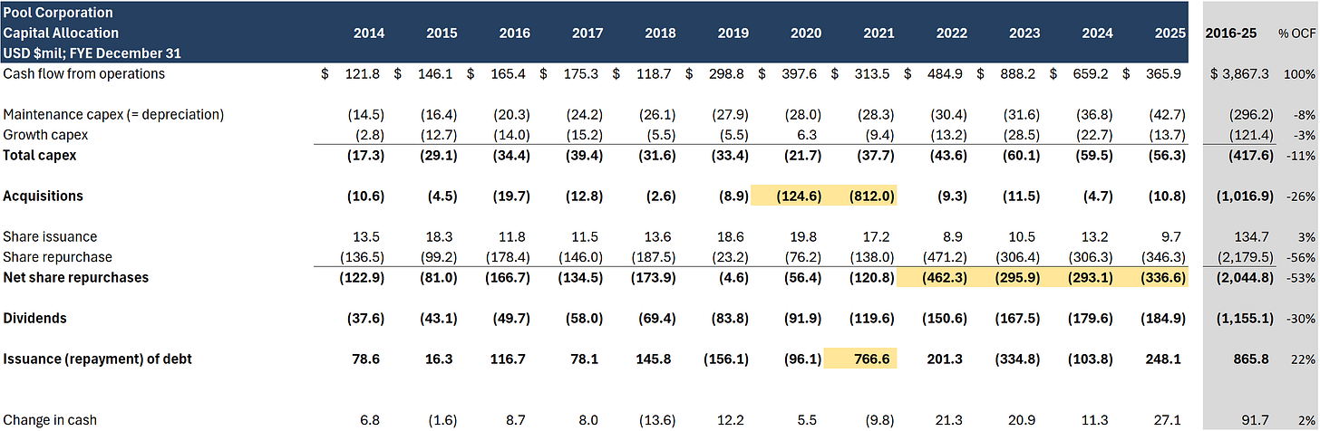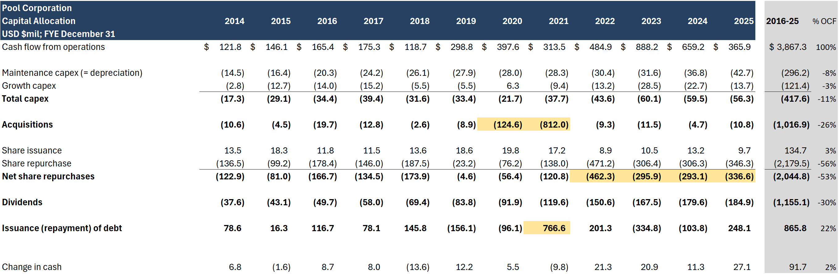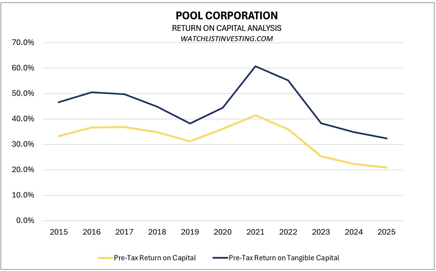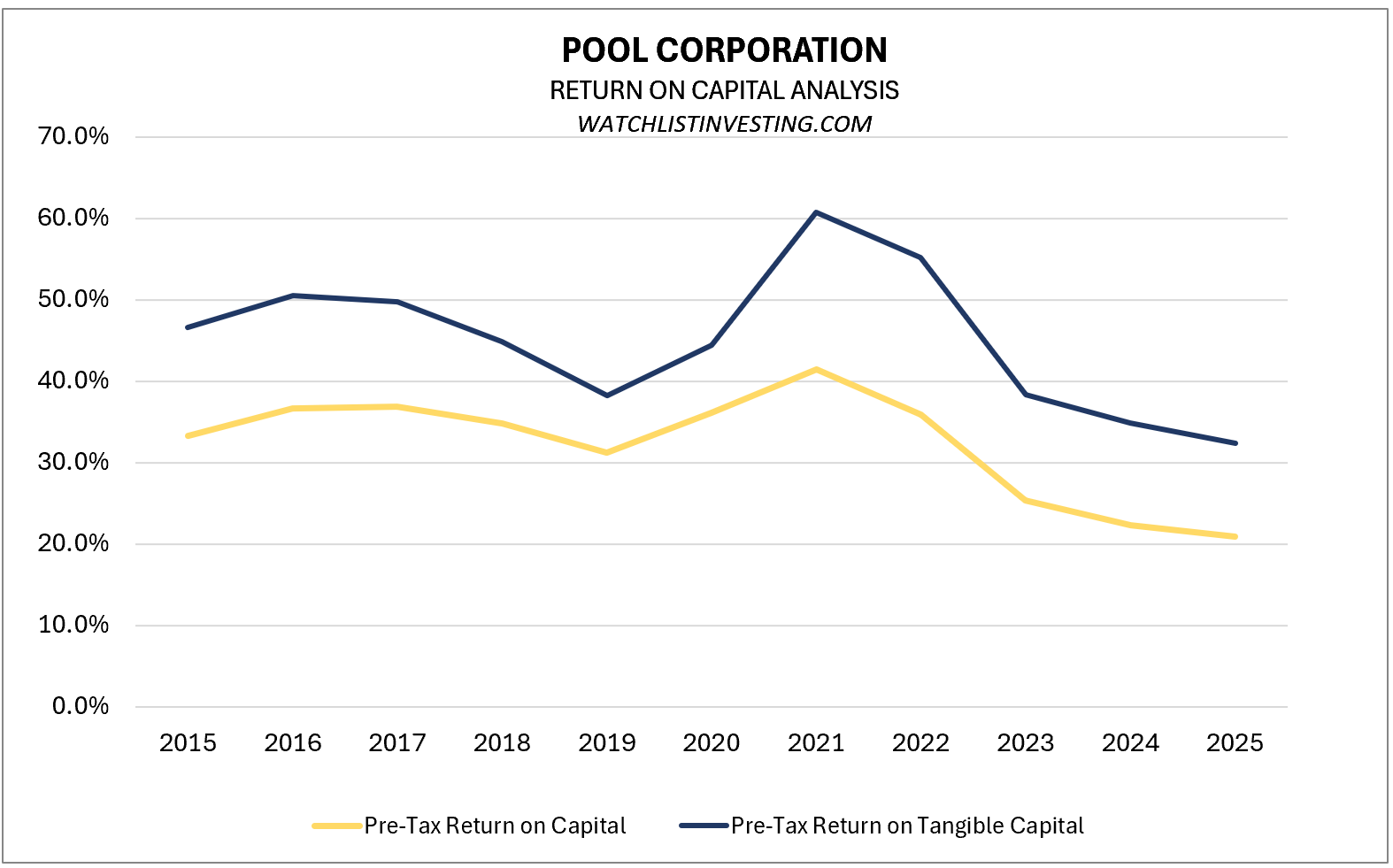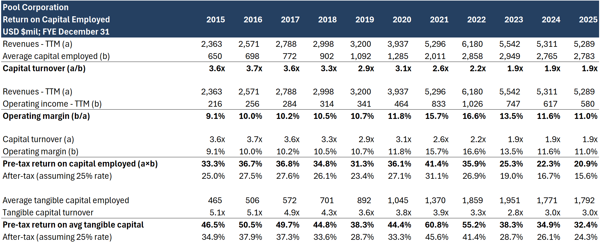 In the working capital section, I noted that Pool’s capital investment appeared structurally higher. I wonder if that means capital turnover will cap at about 2.0x. Similarly, margins would appear to be normalizing around 11%. If those two factors hold, then pre-tax return on total capital will stabilize around 20%. At 3.0x for tangible capital turnover, pre-tax return on capital would be 30%.