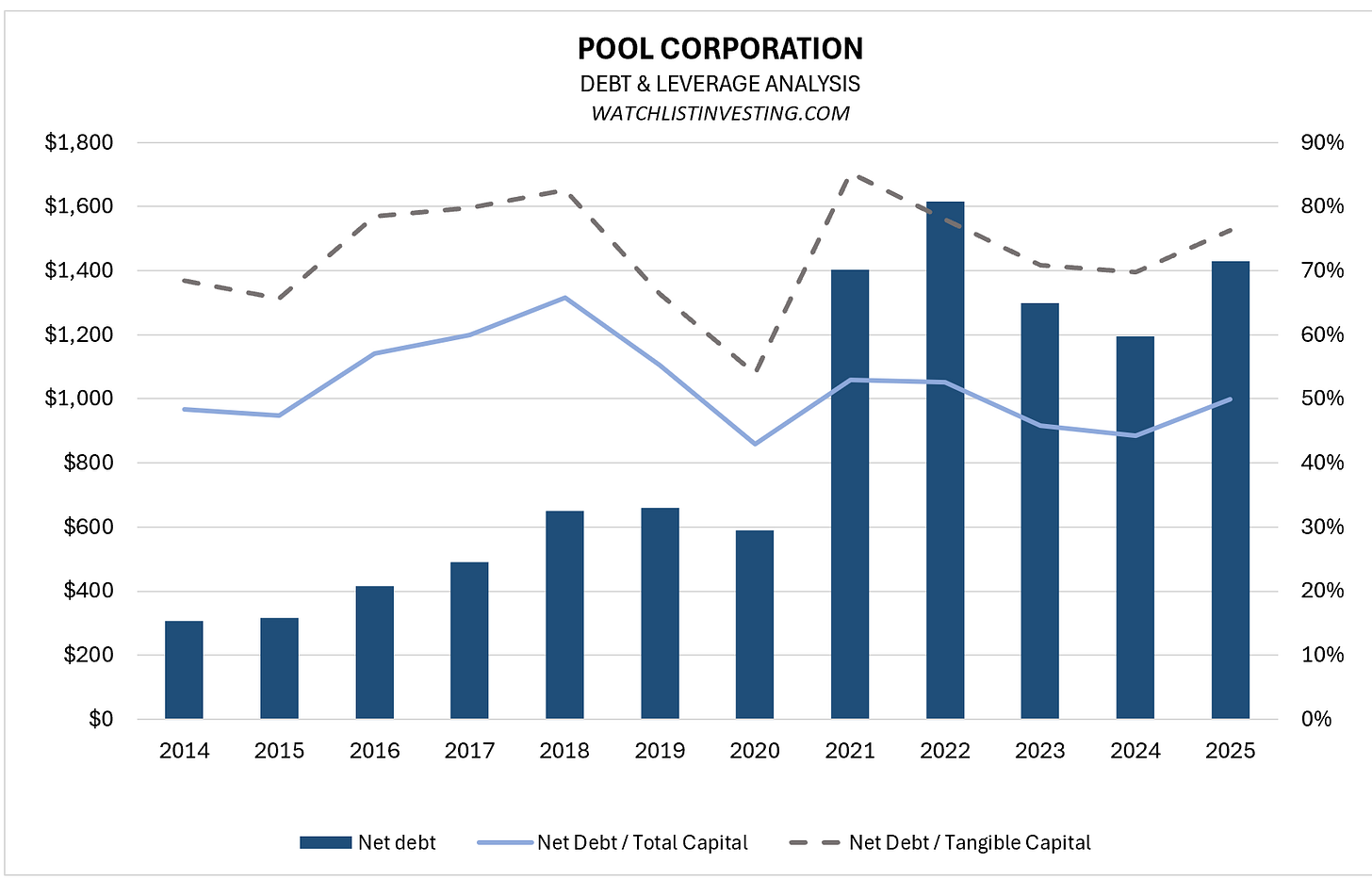 Pool took on debt to fund the Porpoise acquisition in 2021. From a traditional debt to equity/capital/tangible capital, leverage has remained flat. However, debt now stands at a somewhat worrisome 7.5x EBIT.