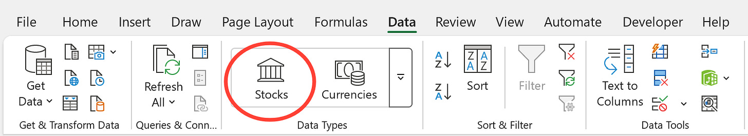 Below is a snapshot of the actual spreadsheet, including my note, from 2024. The description is auto-populated with the stock function. The two columns on the right are my “discard” and “keep going” columns to sort my findings.