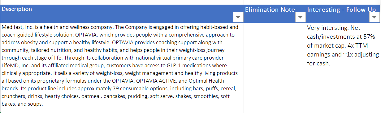 Last week, I wrote about the problem of filtering. Here, I want to show how that process worked in practice using Medifast, a company I eventually added to my portfolio.