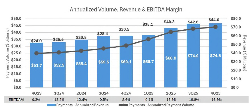 3. EBITDA margin: Included in the 16.9% margin isthe drag from LoadPay startup costs. Excluding LoadPay, EBITDA margin for Q4 was 29.5%. Graft thinks Payments can achieve a 50% EBITDA margin, including LoadPay, at scale.
