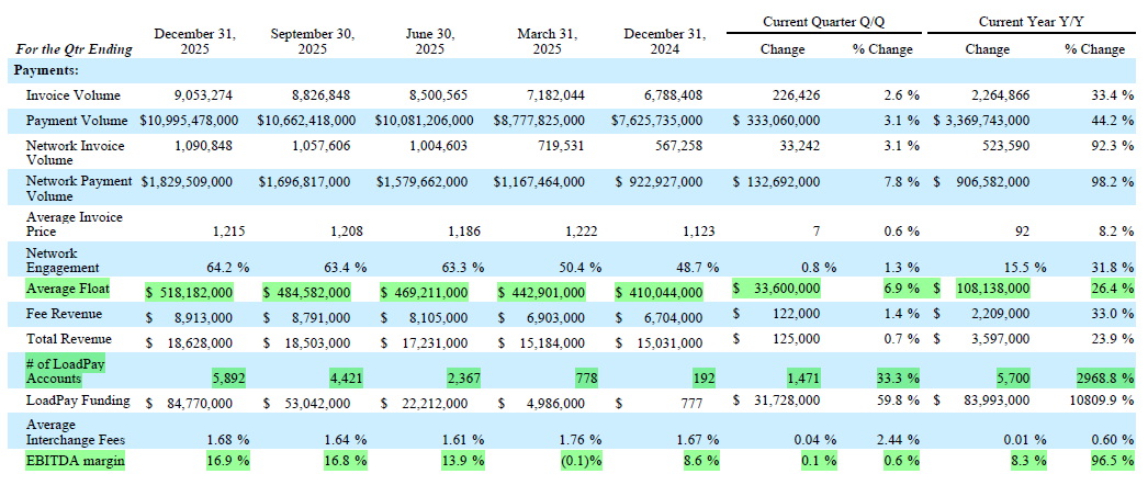 2. Load Pay accounts: This is a relatively new business that not only allows truckers to be paid 24/7 but works to increase NIB deposits as the cash still sits on the TFIN balance sheet instead of going out to a factor. The bank added 1,500 accounts in Q4 and expects to add between 7,000 and 12,000 additional accounts throughout 2026.