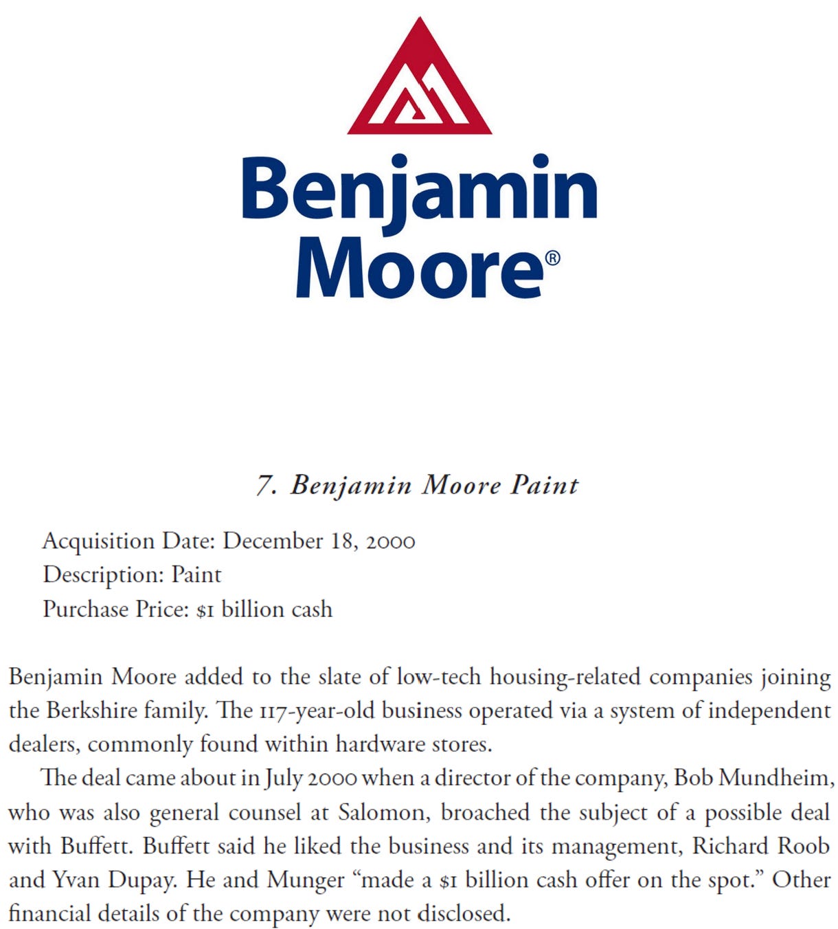 December 18, 2000: Berkshire acquires Benjamin Moore Paint for $1 billion cash