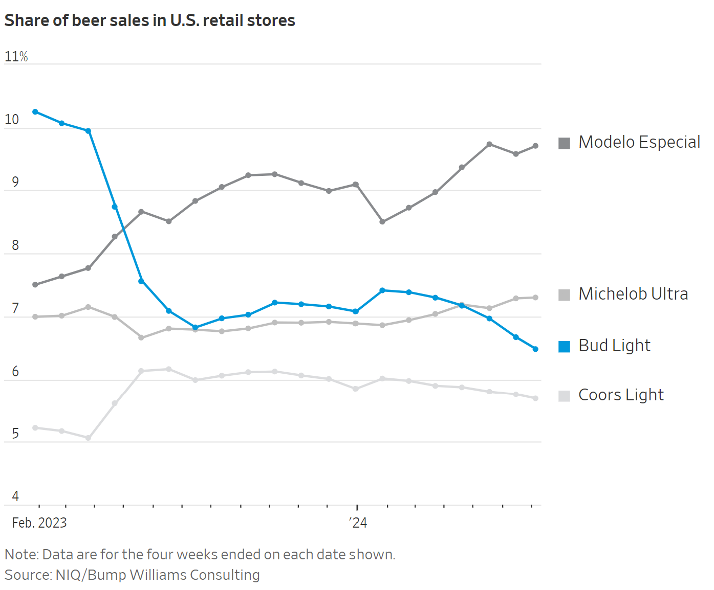 Beer Industry: Bud Light slips to #3. Modelo retains the top spot. (WSJ Link)
